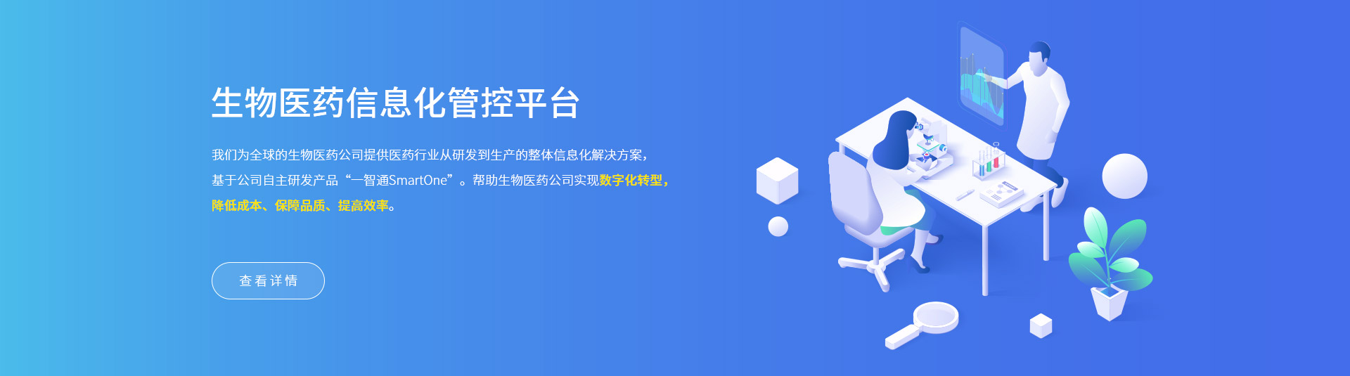 我們?yōu)槿虻纳镝t(yī)藥公司提供醫(yī)藥行業(yè)從研發(fā)到生產(chǎn)的整體信息化解決方案,基于公司自主研發(fā)產(chǎn)品“一智通SmartOne”。幫助生物醫(yī)藥公司實現(xiàn)數(shù)字化轉(zhuǎn)型,降低成本、保障品質(zhì)、提高效率。
